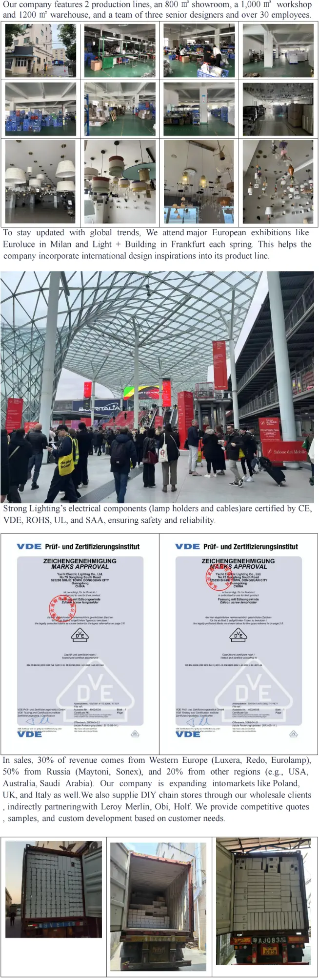 Strong Lighting มีรากฐานมาจากศูนย์กลางระบบแสงสว่างในเมือง Guzhen ของจงซาน โดยได้รับแรงบันดาลใจจากเทรนด์ระดับโลกที่นิทรรศการ Milan Euroluce และ Frankfurt Light + Building เพื่อให้มั่นใจว่าการออกแบบของเราก้าวนำหน้าอุตสาหกรรม เวิร์กช็อปขนาด 1,000 ตารางเมตรและสายการผลิตคู่ของเรารองรับผลผลิตต่อปีที่ตู้คอนเทนเนอร์ขนาด 100 x 40HQ ทำให้เราสามารถรองรับคำสั่งซื้อจำนวนมากในปริมาณมากด้วยคุณภาพที่สม่ำเสมอ