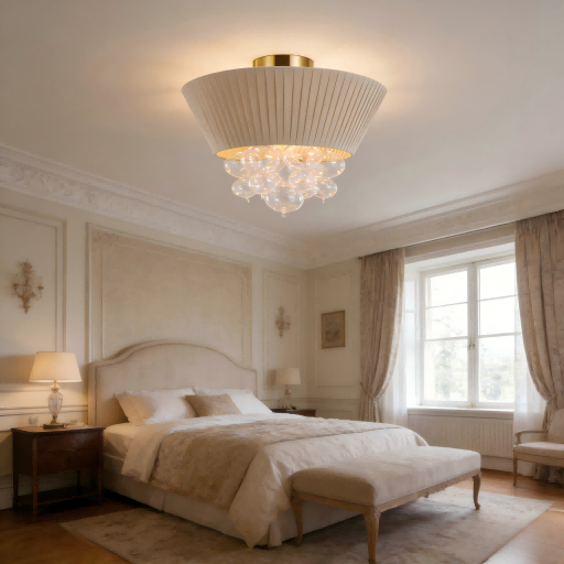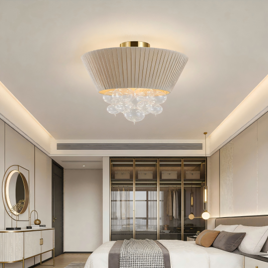 ในระหว่างการให้บริการระยะยาวในตลาดยุโรปและอเมริกา Strong Lighting ให้ความสำคัญกับความต้องการด้านสุนทรียภาพและสถานการณ์การใช้งานของผู้ใช้ปลายทางอย่างใกล้ชิดมาโดยตลอด โป๊ะโคมผ้าของโคมไฟเพดานนี้ผลิตขึ้นด้วยเทคนิคการกดด้วยมือ ทำให้เกิดพื้นผิวจับจีบที่เป็นธรรมชาติและเป็นสามมิติ แสงที่ปล่อยออกมาจะนุ่มนวลและกระจายทั่วถึง สร้างสภาพแวดล้อมแสงที่อบอุ่นและสะดวกสบาย ฟองแก้วที่ห้อยอยู่ด้านล่างถูกเป่าด้วยมือ โดยแต่ละฟองจะมีรูปร่างแตกต่างกันเล็กน้อย เมื่อส่องสว่าง จะดูเหมือนลูกปัดไฟแขวนลอย นำเสนอเอฟเฟกต์แสงและเงาที่มีเสน่ห์และมีชีวิตชีวา ไม่ว่าจะใช้ในพื้นที่พักอาศัยสไตล์นอร์ดิกที่เรียบง่าย หรือสถานที่เชิงพาณิชย์ที่มีสไตล์หรูหราแบบบางเบา ก็สามารถเพิ่มคุณภาพของพื้นที่ได้อย่างมาก